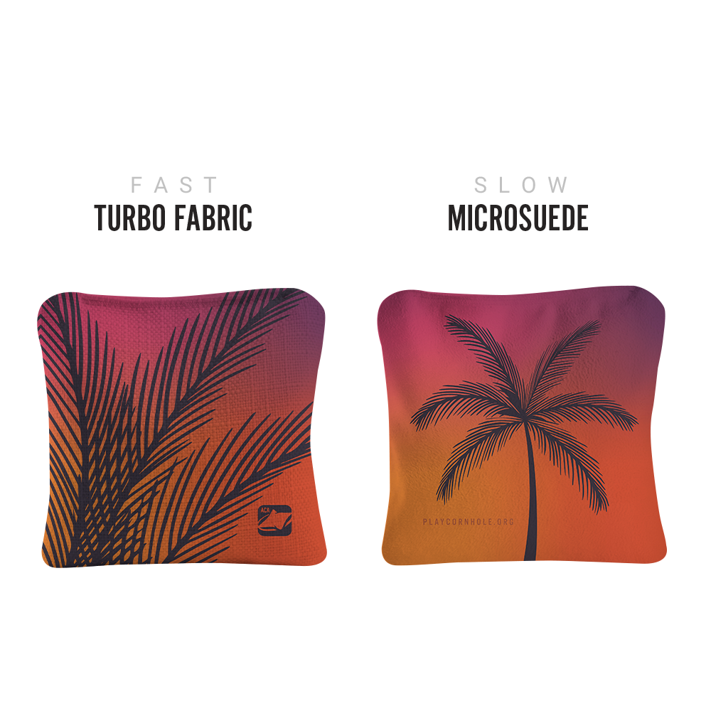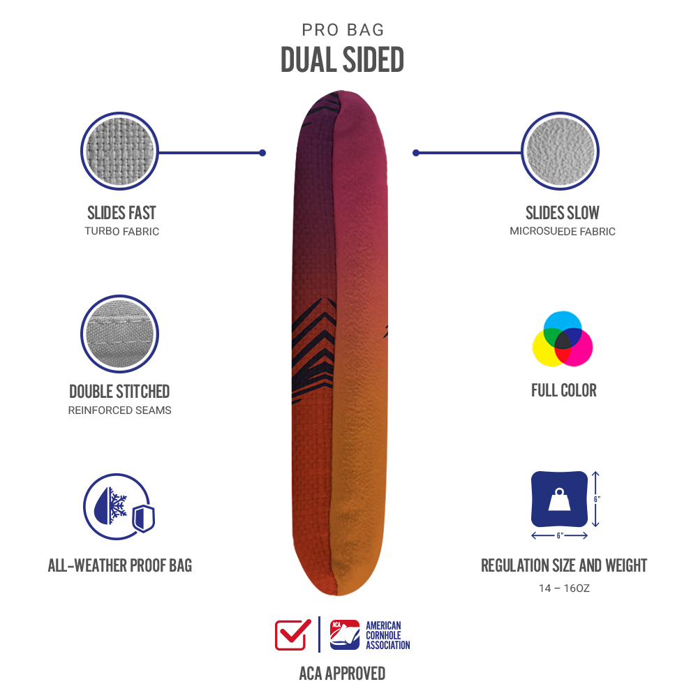 Our Synergy Pro Bags are Dual Sided Bags that are made with 2 different materials and filled with Plastic Resin. Dual Sided Bags give the player the option of a throw that either slides or sticks firm when it hits the playing surface. The "Slow Side" is microsuede and the "Fast Side" is poly turbo weave fabric. The suede grabs onto the playing surface stopping the bag once it hits the playing surface. Great for precision shots or the last point win shot. The poly turbo weave allows the bag to slide on the playing surface - great for scoring throws or knocking off opponents bags.